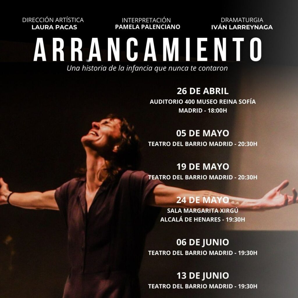 Ahora vuelve al Teatro del Barrio con Arrancamiento, una obra que surge por la necesidad de hablar de la violencia ejercida sobre las madres. La idea nació como un pódcast para Laboratoria y el Museo Reina Sofía, en el marco de un proyecto sobre violencia institucional contra las mujeres. En ese momento, Pamela y su equipo se dieron cuenta de que el formato se quedaba corto y de que iba a ser más eficaz como obra de teatro. Pamela Palenciano lleva años luchando con su activismo por las madres protectoras, conoce sus testimonios y los de las criaturas. Tras una residencia artística de 6 meses en el Teatro del Barrio de Madrid y una campaña de crowdfunding a través de la plataforma verkami, la obra se estrenó en junio de 2023 con 5 funciones seguidas con las entradas agotadas, donde sigue programada de forma regular.