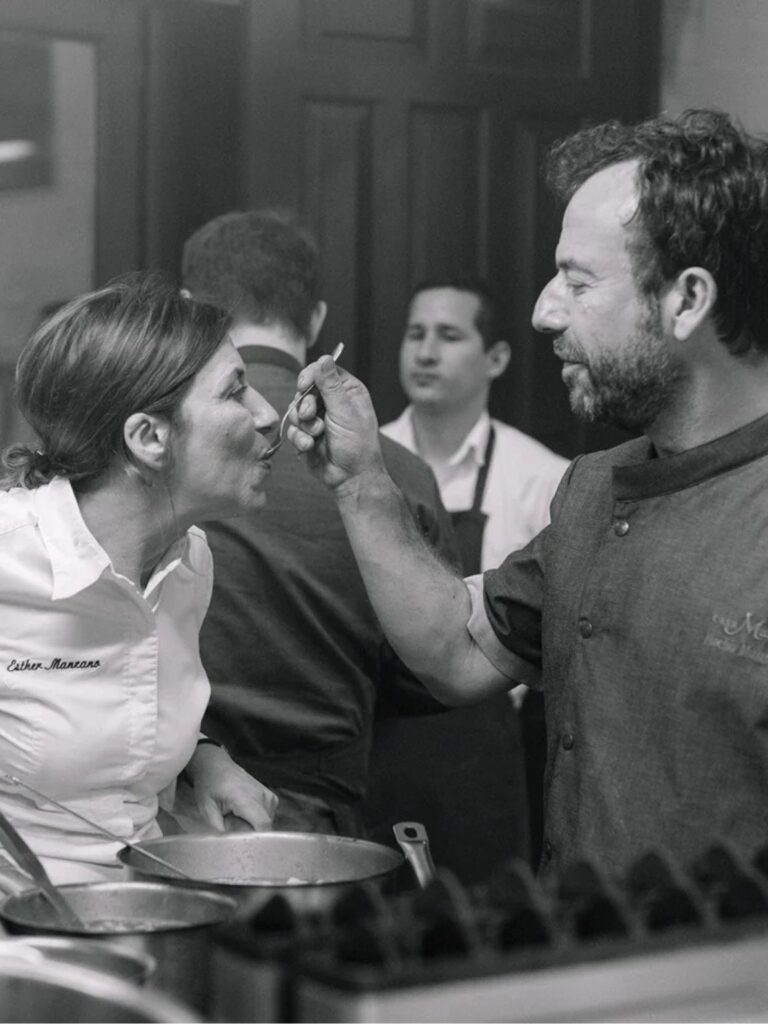 Los hermanos Manzano, Nacho y Esther, son los talentosos chefs y gestores detrás de Casa Marcial, un prestigioso restaurante con dos estrellas Michelin ubicado en Asturias. Casa Marcial se encuentra en Arriondas, en el pueblo de La Salgar, y es reconocido por su cocina asturiana contemporánea, que combina tradición y vanguardia, utilizando productos locales y técnicas innovadoras. Nacho es el chef principal de Casa Marcial y uno de los cocineros más respetados de España. Empezó a trabajar en la cocina desde que era casi un niño, inspirado por su madre y su abuela, y con el tiempo fue perfeccionando su estilo y técnica. A lo largo de los años, Nacho ha logrado construir una propuesta culinaria que reinterpreta los platos tradicionales asturianos, como la fabada o el arroz con pitu de caleya —el «pollo de camino» que daba sabor a las comidas en las fiestas de guardar—, dándoles un giro moderno y sofisticado sin perder el respeto por sus raíces.