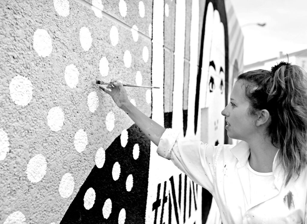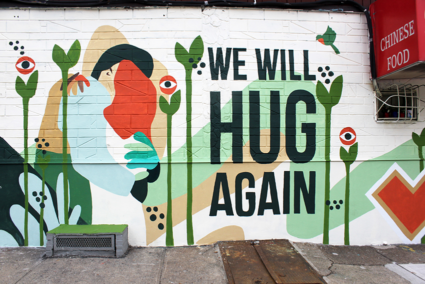De todos los inspiradores proyectos en los que ha trabajado (entre ellos murales reivindicando el papel de la mujer en la sociedad, en las letras y el arte) me gustaría destacar el último mural que pintó en Brooklyn en 2019, “We will hug again”. Vanesa cuenta cómo este proyecto fue el que la reconectó con la Artista después del nacimiento de su bebé, León, y cuenta cómo lo pintó parando para darle de mamar y teniéndole cerca en el carrito mientras transformaba la pared.