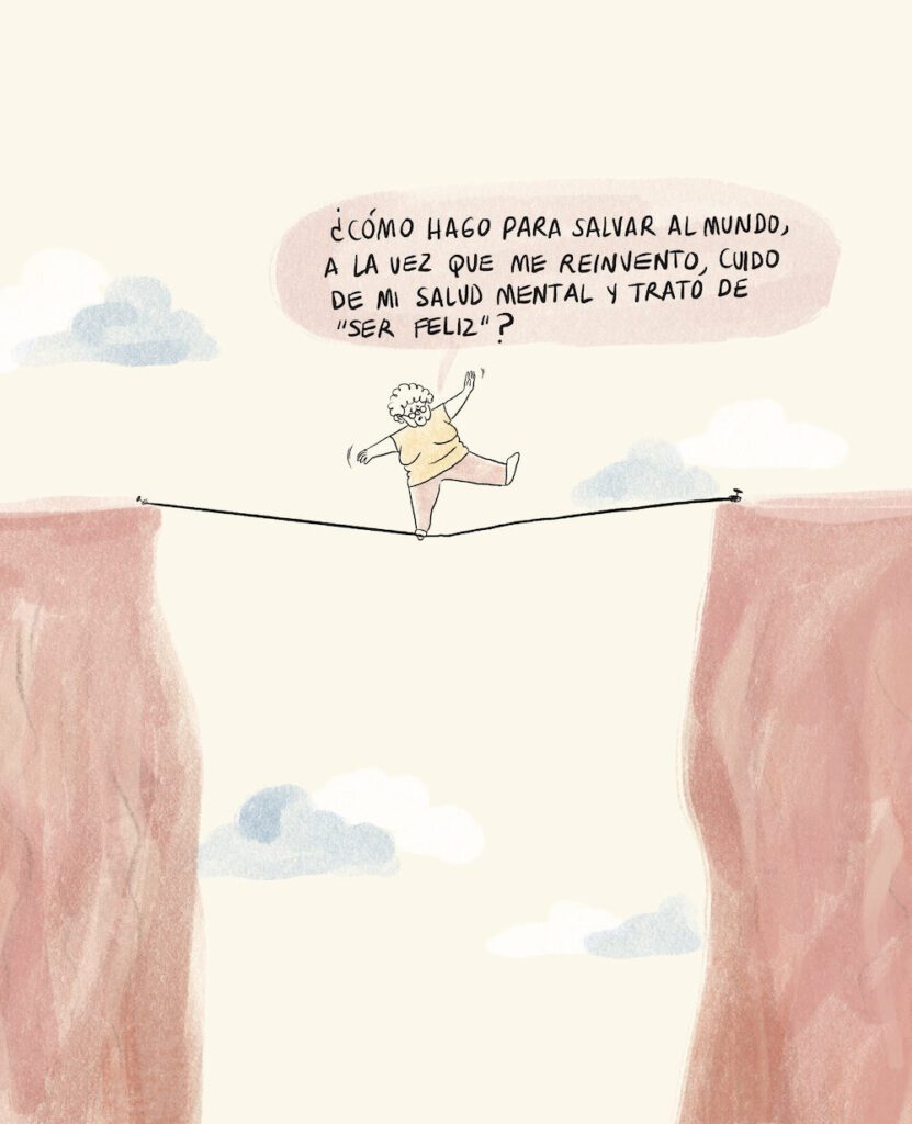 Daniella Martí es observadora profesional y, a través de sus viñetas, narra de lo que ve a su alrededor, en su día a día, con un toque de humor muy especial que esconde tras de sí una crítica social muy potente. En este libro, la ilustradora aborda los temas más recurrentes de su trabajo: el tiempo, la tecnología, las relaciones, el feminismo, la sociedad, la salud mental y la autoconsciencia. Cada uno de estos temas viene precedido de una reflexión en la que la humorista gráfica nos explica cómo surge su interés. Entre sus páginas encontramos a la mítica Carmenza, esa señora de alrededor de 80 años, que vive sola y que se ha convertido en la voz de la conciencia de muchísimas personas —que no tenemos 80 años, ni vivimos solas—: “Carmenza es así, físicamente, porque hay muchas señoras que son así, idénticas. Quise hacer un personaje que fuera lo más identificable posible, que pudieras estar por la calle, ver una señora y que te recordase a Carmenza, que realmente está basado en mi abuela”, desvela Daniella. Mirando a las Veneras y tomando un té, aprovecho la oportunidad de charlar con esta mujer nacida en Cali, residente en Valencia por amor, portadora de unos de los ojos más vivos que he mirado. Esa vida en sus ojos es la que le permite observar tanto y tan bien. Ahora lo entiendo todo.