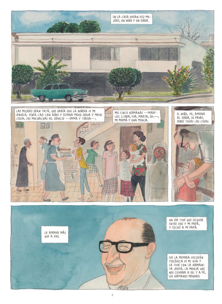 “Vivo muy agradecido con cualquier persona que lea El olvido que seremos —comenta Héctor Abad Faciolince—. Cualquiera que la lea, habiendo un universo de libros tan extraordinario, tantas obras geniales nuevas, antiguas, clásicas… yo vivo muy agradecido”. Tyto Alba (Badalona, 1975), sin embargo, llegó virgen a la propuesta de Mejías para crear la novela gráfica: “Me sabía un poco mal no conocer el libro cuando supe que era una novela tan popular y tan leída. Cuando lo descubrí, me encantó. Me dio mucho miedo meterme ahí porque adaptar una novela es muy complicado. Hacía mucho tiempo que había adaptado un par de novelas, cuando empezaba, de Gabi Martínez —Sudd y Sólo para gigantes—. Recuerdo que todo fue bastante complicado. Había varios retos que me interesaban. Uno era, por ejemplo, era que casi siempre había hecho biografías de personajes —la última de Walt Whitman—, siempre me he ido a épocas muy del pasado. Esto me parecía una historia más contemporánea, aunque se habla de los años 60-70. Eran atmósferas que yo no había tocado. Sigue siendo una biografía, de hecho, es como si siguiera la misma línea. Todas estas cosas, el hecho de hablar también de un país que no conozco, que por un lado también te da un poco de vértigo porque no he estado nunca en Colombia, pero por otro lado me interesa aprender como una cosa personal”.
