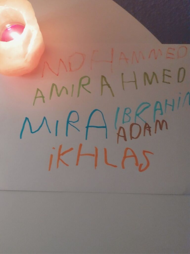 Le muestro a mi hijo de seis años la foto que me acaba de enviar Moha. Allí están las cinco criaturas que tiene junto a Ikhlas, una mujer llena de coraje y valentía. Allí aparecen los rostros luminosos de Ahmad, Ibrahim, Adam, Amir y la pequeña Mira. «¿Dónde están, en el jardín?», me pregunta Mün. No, viven en una tienda de campaña. «¿Entonces no tienen casa, mamá?». «No tienen casa». «¿Y por qué no les invitamos a venir a la nuestra?». «Porque viven muy lejos y no les dejan salir de su país». «¿Y qué podemos hacer para que salgan, mamá?». «Yo estoy enviando mails contando su historia a embajadas, eurodiputadas, ONG, escribiendo a todo el mundo». «Yo también voy a escribir, mamá, voy a escribir sus nombres». Mientras mi hijo escribe sus nombres con rotuladores de colores, yo sigo escribiendo mails y llamando a diferentes puertas. Tengo referencias de compañeras que se han dejado la piel y lo han conseguido, han colocado a familias enteras en las listas de evacuación y por eso sé que existen los milagros. Cada noche ponemos una vela junto a los nombres de Mohammed y su familia. A veces sueño que estoy con mis hijos en una tienda de campaña, a veces que desayunamos junto a la familia de Mohammed en la cocina de mi casa. Aprieto el cuerpo de mi hija Xilu contra el mío, el corazón late tan fuerte que estoy segura de que lo puede escuchar mi querido Moha, estamos juntos en esta noche, miramos la misma luna.