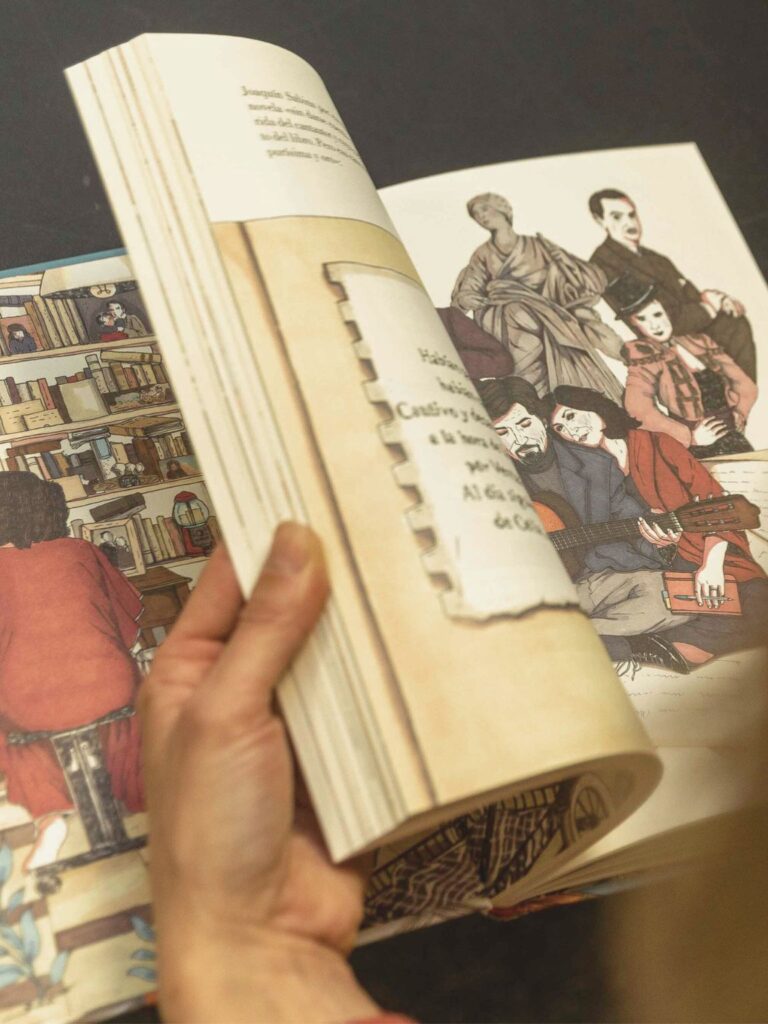 Tras su último trabajo editorial ilustrado, el bellísimo Escritoras: Una historia de amistad y creación junto a Carmen G. de la Cueva, Ana Jarén se ha enfrentado al reto de retratar con dibujos la intimidad de Almudena: «Ha sido muy distinto este trabajo a como yo suelo hacerlo. Normalmente, te llega el texto y tú das tu visión. En este caso, hemos trabajado mano a mano. Somos amigas, vivimos cerca y eso ha facilitado mucho cómo hemos encarado este proyecto. Aroa iba adelantándome líneas o temas sobre los que quería hablar y ha sido muy generosa. Cuando me pasaba fotos que le cedía la familia, yo iba ilustrando a todo riesgo. Todo fue tan bien, lo hemos disfrutado tanto… Yo no conocí personalmente a Almudena y ha sido maravilloso descubrirla a través de los ojos de Aroa. Me he metido dentro de su ambiente, obsesionada por ser muy fiel con los espacios. Hay muchas cosas que no son para el lector, sino para la familia. Han sido tan generosos con nosotras que quería devolverle esos guiños mediante detalles en los dibujos».