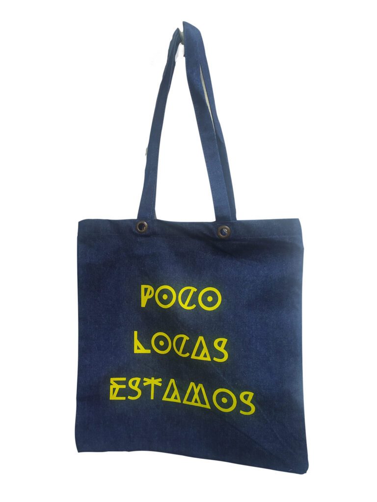 Surgió en Enero de 2021 leyendo un artículo de la psicóloga Mónica Manrique en eldiario.es, en el que hablaba del síndrome de burnout de madre pandémica. Al final del artículo, Mónica cita en un párrafo estas 3 palabras que se me quedaron grabadas en corazón y cerebro a la vez. Ese mismo día lo compartí con unas amigas del barrio, mi burbuja de 6 por aquella época de confinamientos y restricciones, que habíamos creado un par de meses antes para juntarnos a cenar cada 2 semanas y compartir cachopo terapeútico, risas y cañas después de una época muy difícil para todas. Una de ellas pensó que Poco Locas Estamos era un hashtag mío por mi afición a las redes sociales, y en ese momento propuse hacer algo con ese mantra. Lo primero que se me ocurrió fue estampar seis camisetas para nuestra pandilla burbuja. Mi amiga Otijane, experta en el mundo textil y amiga amarilla, me sugirió hacer bolsas tote. Estuve meses pensando cómo y qué, quería hacer algo diferente. Un día, encontré estas bolsas tipo denim, sostenibles, ecológicas y diferentes, y lo vi claro. Encargué dos de prueba y, a continuación, me lancé con un pedido inicial de 60. Volaron.