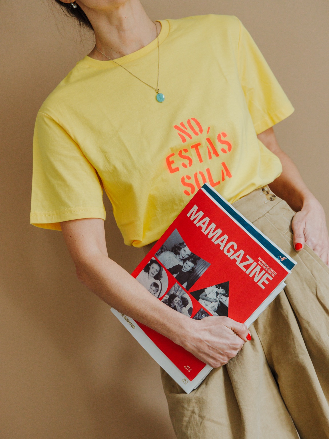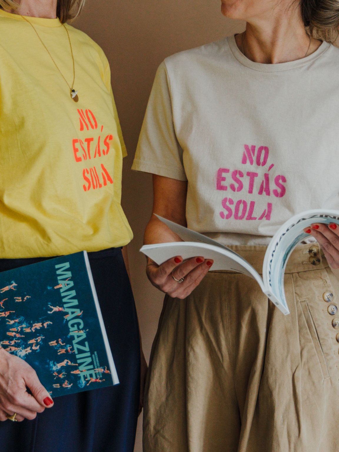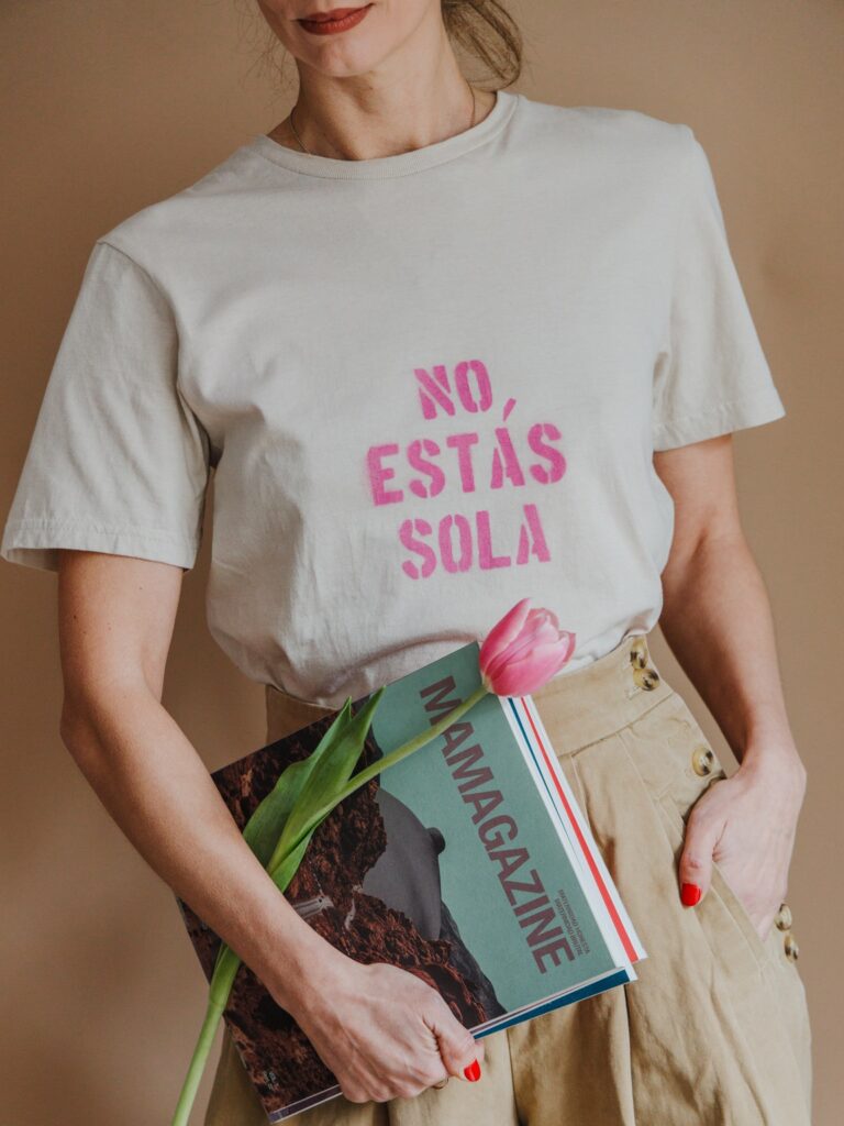 Camiseta “No estás sola”, colaboración con la firma El gallo de oro, una marca de camisetas inspirada en el street art que utiliza el stencil y la estética del graffiti como medios. Surgió en Colombia en 2016 de la mano de Silvana Bonfante, antropóloga, y María Paula Martínez, fotógrafa y diseñadora, quienes encontraron en este emprendimiento un espacio para desarrollar su creatividad fuera de su espacio formal de trabajo y como terapia ante una crisis vital en la que, afortunadamente, ambas coincidieron. El Gallo de Oro cree firmemente en la belleza de la imperfección y la entropía, así que la “torpeza” de las impresiones que ilustra cada prenda hace parte de su encanto.