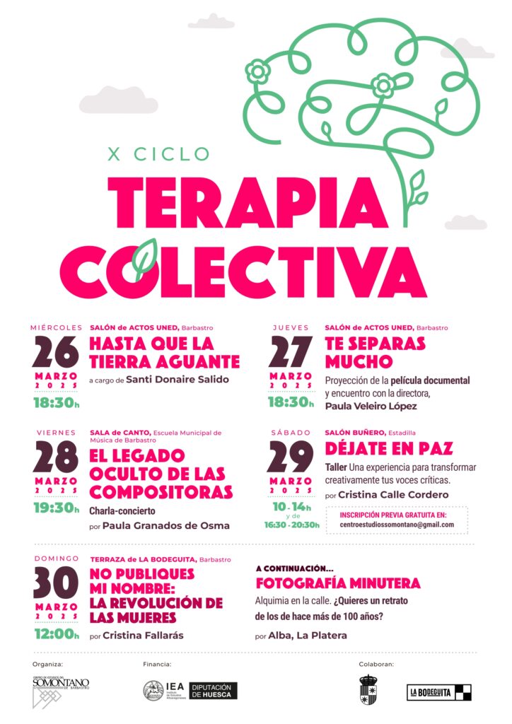Desde hace diez años, Terapia Colectiva ha tenido el afán de crear espacios de encuentro en el Somontano, con el objetivo de acercar propuestas innovadoras y debates críticos a la comunidad. Organizado por el Centro de Estudios del Somontano de Barbastro, este proyecto ha apostado por una programación que explora temáticas novedosas o con un enfoque radicalmente distinto, promoviendo el pensamiento crítico y la expresión artística como herramientas de transformación social. A lo largo de estos años, ha traído a todo tipo de profesionales, con un porcentaje altísimo de mujeres, casi siempre mujeres, abarcando disciplinas como el cine, la música, la filosofía y la literatura, entre otras.
