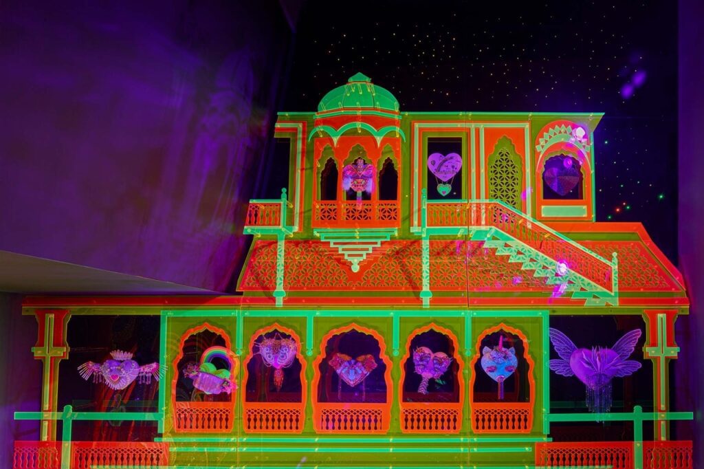 Otra de las salas que llamó poderosamente mi atención fue Ready to Love, del artista indio Manish Arora. «Le invito a este paraíso amoroso donde el corazón manda y lo conquista todo. Los corazones de esta sala son un acto de amor, cada uno hecho a mano con diversas técnicas tradicionales indias. Expresan una emoción con la que todos podemos identificarnos y una visión que nos hará sonreír». Y es cierto: la intervención de los corazones expuestos, las luces de neón y las escaleras son el reflejo de una utopía tecnicolor que no esconde críticas al amor tóxico. Nuevamente, cada sala es una oportunidad de interpretaciones infinitas, solo hace falta poner atención para descubrirlas.