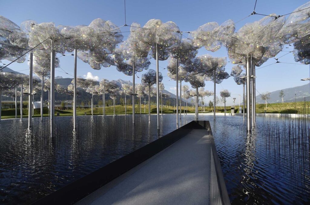 A la salida del Gigante, la integración de los cristales con la naturaleza sigue siendo sorprendente: varias instalaciones de arte contemporáneo, entre las que destacan la Nube de Cristal o la Piscina de los Espejos siguen otorgando placeres multisensoriales. Entre las sorpresas de los jardines se encuentran una torre de juegos, un parque infantil, un laberinto y el precioso carrusel ideado por el diseñador madrileño Jaime Hayón. Como curiosidad, las más de siete hectáreas de los jardines albergan los restos de una muralla procedente de una finca en una calzada romana que atravesaba el valle de río Inn. Tras casi dos mil años sepultados, además de los restos se encontraron más de setecientas monedas de plata romanas.